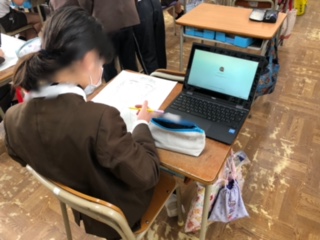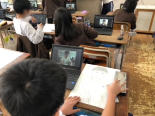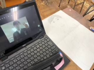 自分の顔を描いています。端末には自分の顔の写真が入っています。