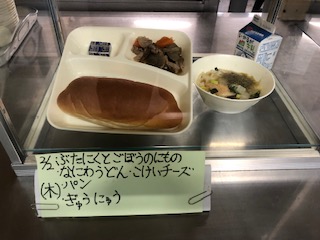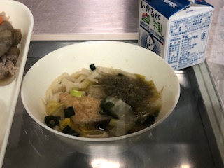 今日の給食は、なにわうどん(きつねうどん風)がでました。大阪の郷土料理ですね。チーズもつきました。