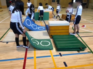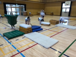 子どもたちがとび箱やマットを準備している場面もご覧ください。慣れた手順でテキパキと準備しています。
