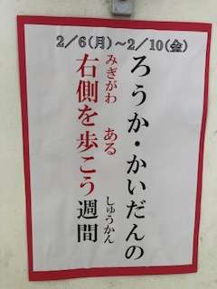 今週は「ろうか・かいだんの右側を歩こう週間」です。校内にポスターが貼られています。