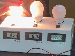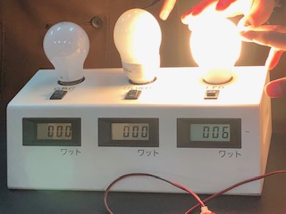 次の実験は、白熱電球、蛍光灯、LED(左からこの順です)の消費電力を調べています。手をかざしているのは熱さを確かめているところです。(直接には触っていません)黄色矢印が消費電力です。