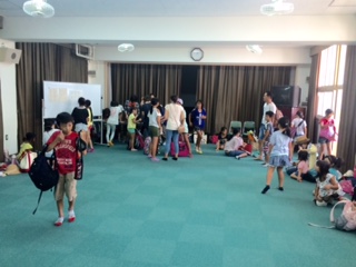 猛暑の中、キャンプに参加する児童・保護者が集まってきました。