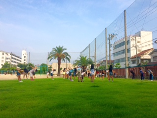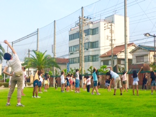PTA主催「学ぶ・感じる食育キャンプ」第2日目の朝です。芝生広場でラジオ体操しました。