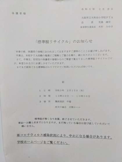 本日の学習参観・懇談会後の標準服リサイクルについて