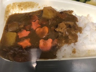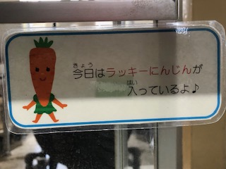 今日のカレーライスにはラッキーにんじんが入っています。ハート形、星形、そして、動物(くまでしょうか)などの形がのっていますね。
