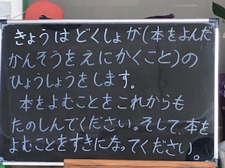 今日は読書感想画の表彰をします。本を読むことを楽しんで好きになってください。