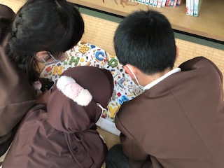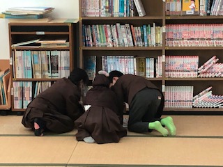 畳の部屋でうずくまっている子どもたちがいました。様子を見ると大きな本をいっしょに読んでいました。