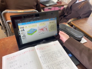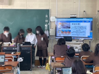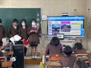 社会科で、自然災害について自分たちで調べたものをスライドにまとめ、発表しています。