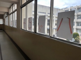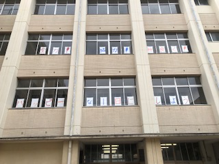 校舎の窓に今日のなかよしフェスティバルのスローガンが掲示されています。