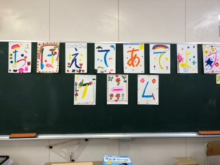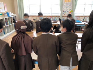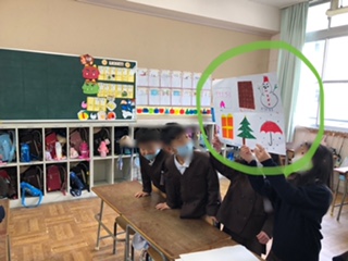 このクラスでは、絵(写真中の緑丸)を見せて、どれだけ覚えているかを競うゲームです。下の写真で、手前がまわっているたてわり班、向こうがお店当番です。