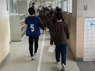 なかよしフェスティバルでは、たてわり班でお店をまわります。写真上・中は次のお店に行くところですね。写真下は、「私たちのお店に来てください」と案内をしている場面です。