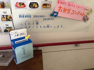 6年生のお弁当コンテストをしています。投票箱が置かれていて他の学年の子どもたちが投票していきます。