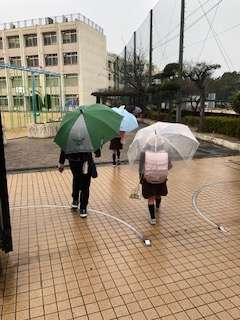 子どもたちが学校へ来る時にはすでに雨が振っています。子どもたちは傘をさして登校してきました。