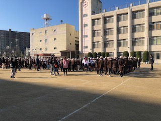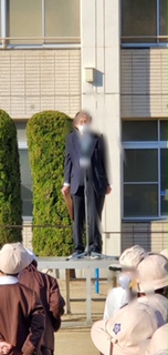 今日の児童朝会は晴天の運動場で行いました。はじめに転入生の紹介をして表彰をした後、校長が先週のなかよしフェスティバルについて話しました。