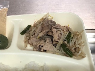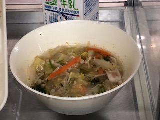 今日の給食は、すまし汁、豚肉と野菜の炒め物でした。