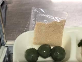 今日の給食には、よもぎだんごがつきました。きな粉もあり、ふりかけて食べました。