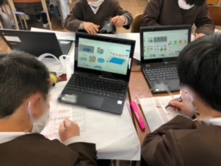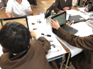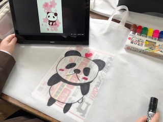 4年生での作品を入れる袋に端末を見ながら絵を描いています。