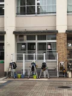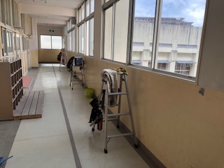 今日は業者の方に校舎の窓の清掃をしていただきました。(写真は清掃で使われている脚立です。高い階の窓もきれいにしていただきました。)