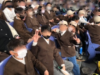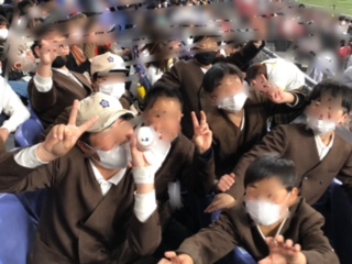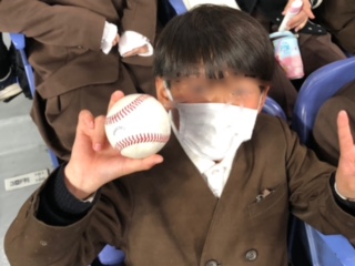 試合観戦の様子です。写真中は、ネット越しにプレゼントされたボールを手にしているところです。
