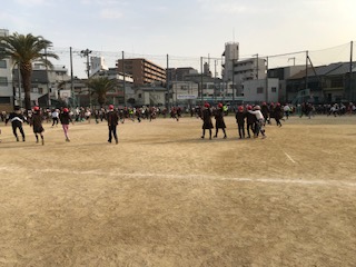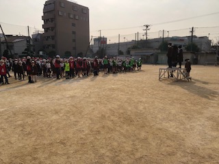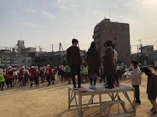 今日の児童集会は、最初に5年生が鬼となっての全員鬼ごっこです。集会委員会の子どもたちが進めています。(写真中)