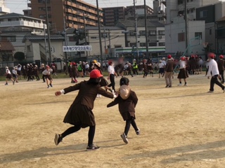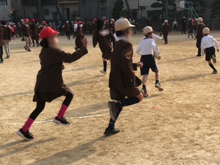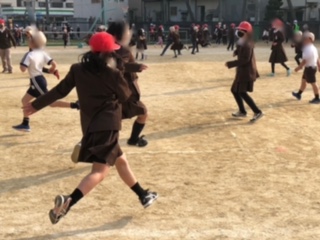 最初に鬼になった5年生が走り回っています。