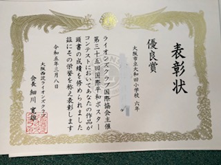 今日の表彰は、ライオンズ国際協会主催の「第35回国際平和ポスターコンテスト」です。優良賞の表彰状が手渡されました。また、副賞がついている児童もいました。