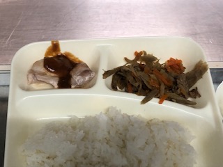 今日の給食には、鶏肉が味噌バターソースの味付けで提供されました。