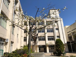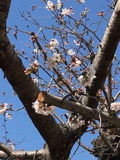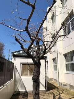 大和田小学校の校庭の桜も咲き始めました。暖かい春の日の青空に映えています。