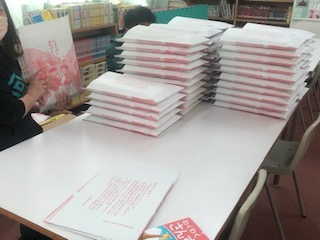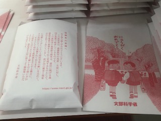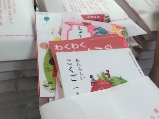 教科書は国から無償で提供されます。文部科学省の名前が書かれた袋に1年生の教科書を入れています。
