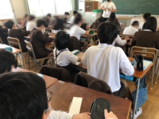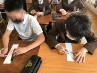 写真上と中は、自己紹介のカードでしょうか?上から何センチをあけておくように担任が話しています。