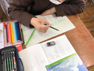 写真下は、国語の詩の学習です。詩の絵を描いています。