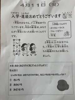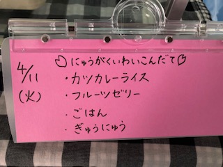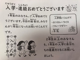 今日の給食は、1年生の入学をお祝いする献立です。写真上と中は、給食カレンダーです。教室に掲示されています。