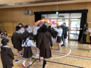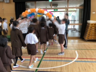 1年生を迎える会は終わりました。アーチがくぐって退場していきます。退場の時も6年生が手をつないでいました。
