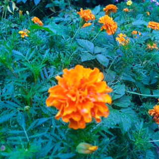 昼前から、雨がしとしとと降り始めました。中庭のマリーゴールドは生き生きとしています。