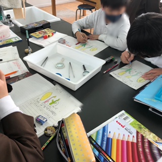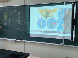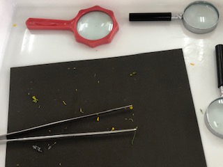 アブラナの花をピンセットや虫めがねを使って観察して記録しています。