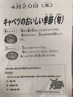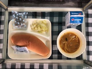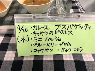 今日の給食は、カレースープスパゲッティでした。キャベツのピクルスもつきました。