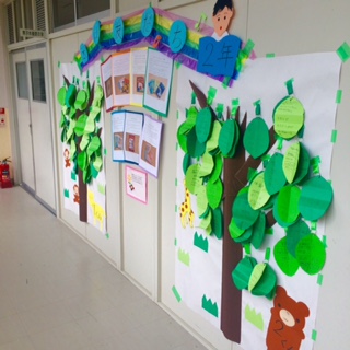 2年生では、読書の取組として「本は友だち」と題して、読書の木のオブジェが廊下にあります。