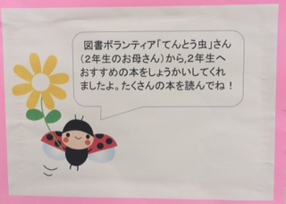 また、2年生の保護者、てんとう虫の皆さんから、おすすめの本を紹介していただきました。ご協力ありがとうございます。