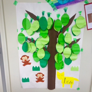 1組・2組が「読書の木」に読んだ本の名前と感想を、葉っぱ型の画用紙に書いて付けて行きます。さてさて、どちらのクラスの木が、たくさん葉っぱを茂らせるでしょうか。
