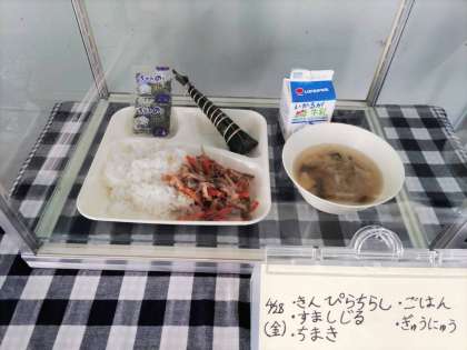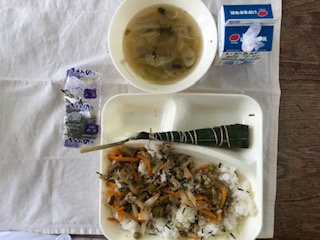 今日は、こどもの日を記念しての行事献立です。ちらし寿司、すまし汁に加えて、ちまきもつきました。