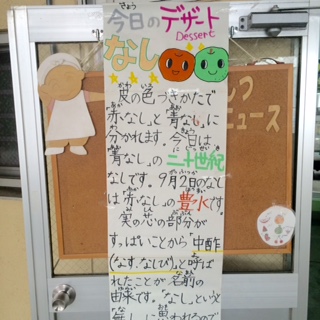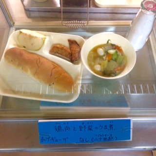 本日の献立は、鶏肉と野菜のうま煮、あげ餃子、二十世紀梨、レーズンパン、牛乳です。