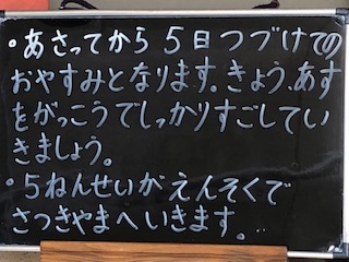◯今日と明日は、5連休前の平日です。しっかりと過ごすように子どもたちを見守っていきます。