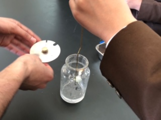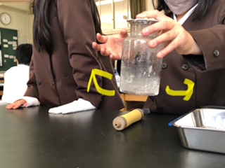写真上・びんの中でろうそくを燃やします。消えたらすぐにふたをします。