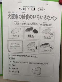 今日には、毎日の献立や給食に関することが書かれた給食カレンダーが掲示されています。5月の給食献立表も貼られています。