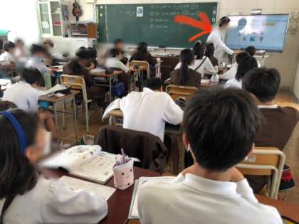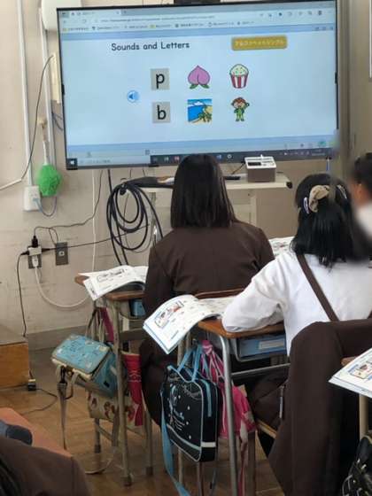5年生と6年生の外国語は、近隣の小学校の教員が授業を行っています。(赤い矢印)今日はPとBの発音の違いをかくしやまわわ
