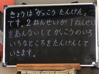 今日は、学校たんけんです。2年生が1年生を連れて学校のいろいろな部屋などをたんけん(見て)していきます。