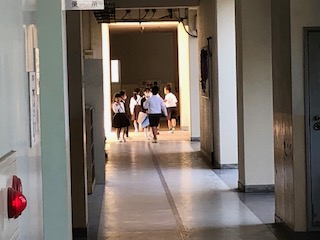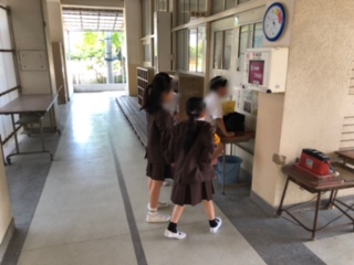 グループになって、たんけんしていきます。2年生が1年生をリードしています。