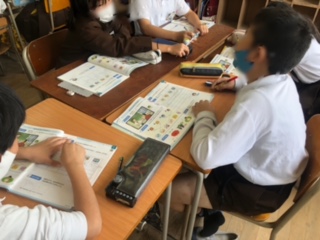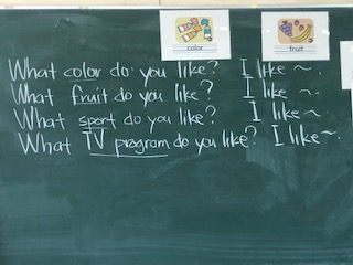 外国語の授業です。「あなたは何が好きですか?」のいろいろなバリエーションで考えています。