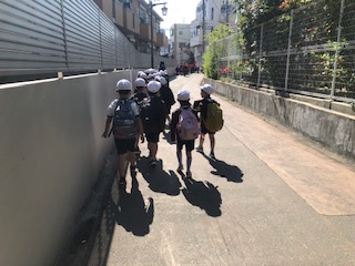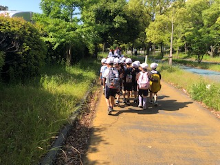 元気よく学校を出発して福駅へと向かいます。はじめての遠足に子どもたちもうきうきした表情です。
