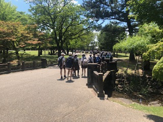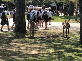 お弁当、おやつ、そして、ごみを拾ってきれいにして春日野園地をあとにして近鉄奈良駅へと向かいます。鹿も見送っていますね。